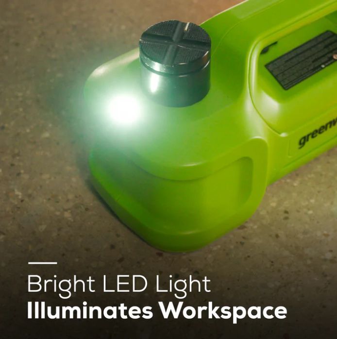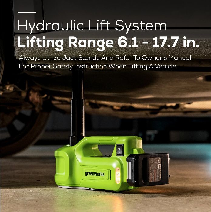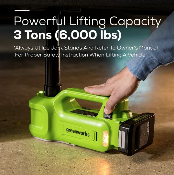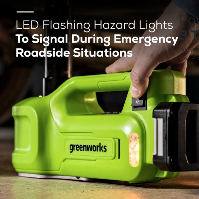 Домкрат Greenworks G24JACK - поможет обслужить личный или коммерческий транспорт до трех тонн именно там, где это необходимо. Гидравлический домкрат имеет встроенную самоблокирующуюся силовую конструкцию и защиту от перегрузки. Прост в использовании благодаря легкому подъему одной кнопкой. Этот автомобильный домкрат оснащен встроенными светодиодами и оранжевыми лампочками-вспышками для освещения рабочей зоны.