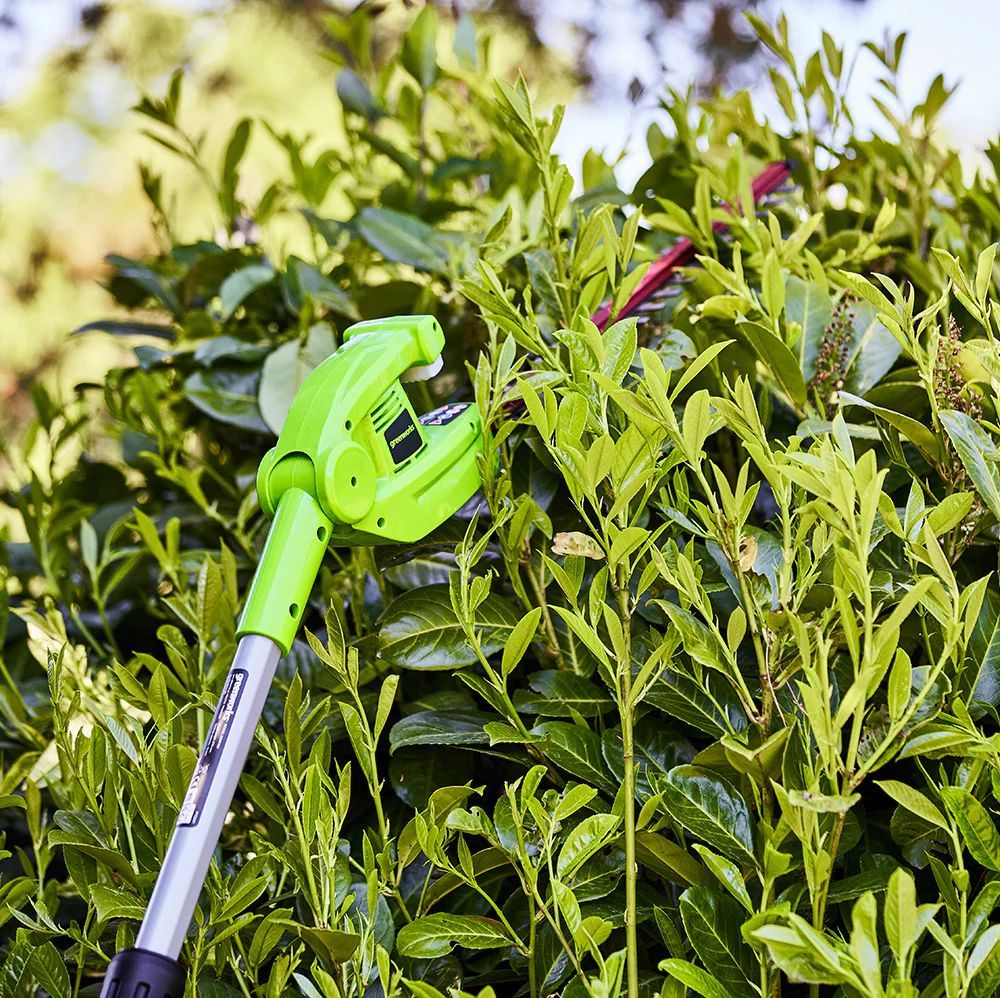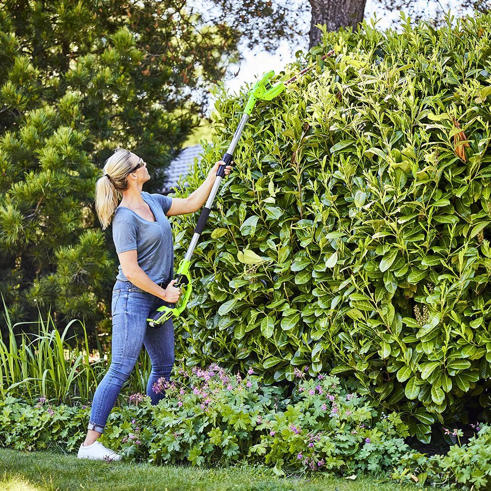 Беспроводной телескопический кусторез Greenworks G24PH51 идеально подходит для стрижки высоких живых изгородей благодаря своему легкому весу и телескопической конструкции.
